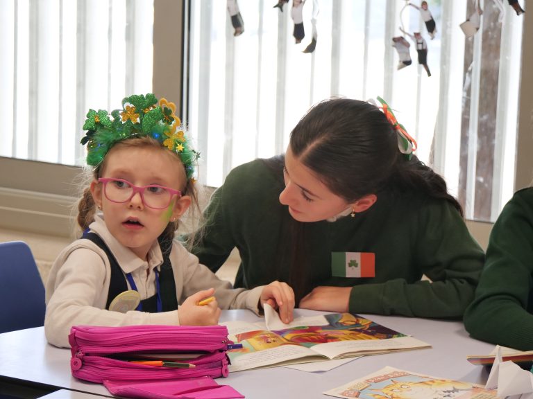Al llarg de la jornada va haver-hi moltes activitats amb un tema comú, l’anglès. Les professores natives van explicar contes en anglès sobre Irlanda i els leprechauns. En la sala d’actes, les alumnes de l’extraescolar de teatre van representar la història de St. Patrick, i després van buscar leprechauns per tot el pati, apuntant en anglès on els trobaven. A més, van compartir moments de lectura entre majors i petites i van participar en tallers creatius, com a xapes amb motius irlandesos, bingo en anglès, pinta cares i dibuixos.